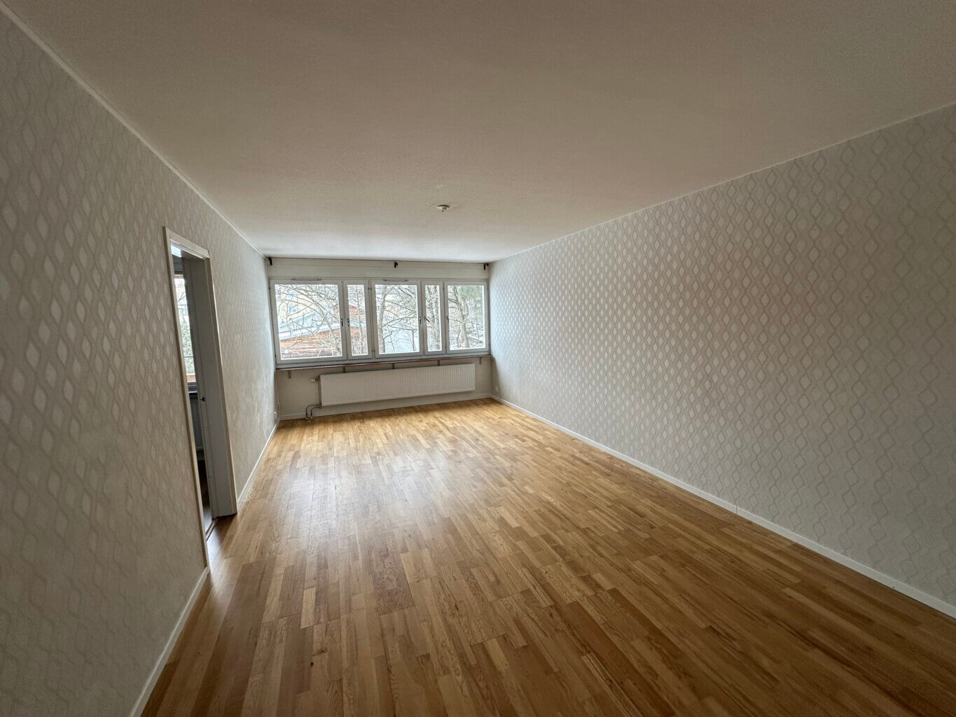 Vardagsrummet är generöst tilltaget med fönster längs ena väggen som släpper in rikligt med dagsljus och skapar en luftig atmosfär. Här finns gott om plats för både soffgrupp och matplats, vilket gör rummet idealiskt för både vardag och umgänge.