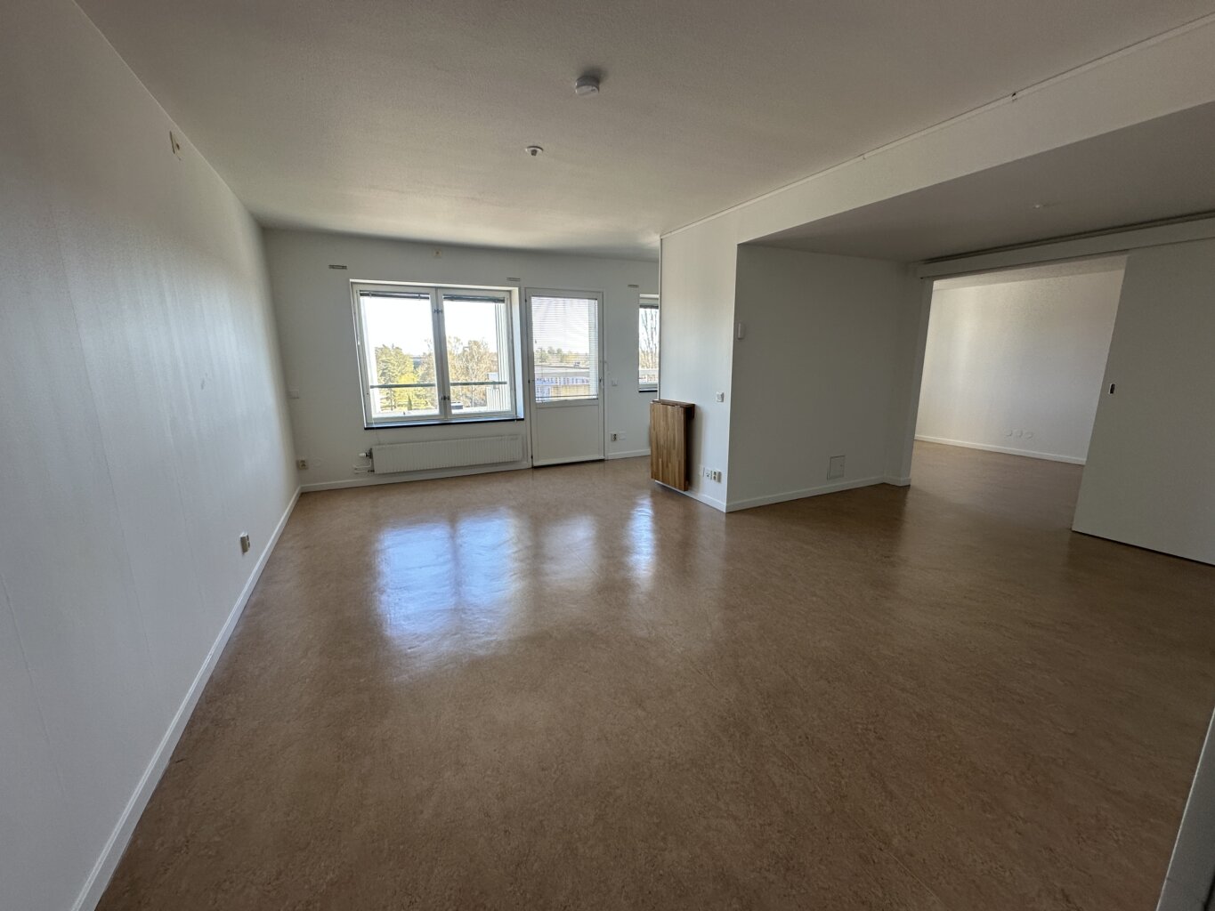 Lägenheten har ett sovrum som enkelt kan avskiljas med skjutdörr, vilket ger en flexibel och funktionell planlösning. De stora fönsterpartierna bidrar till ett härligt ljusflöde genom hela bostaden.