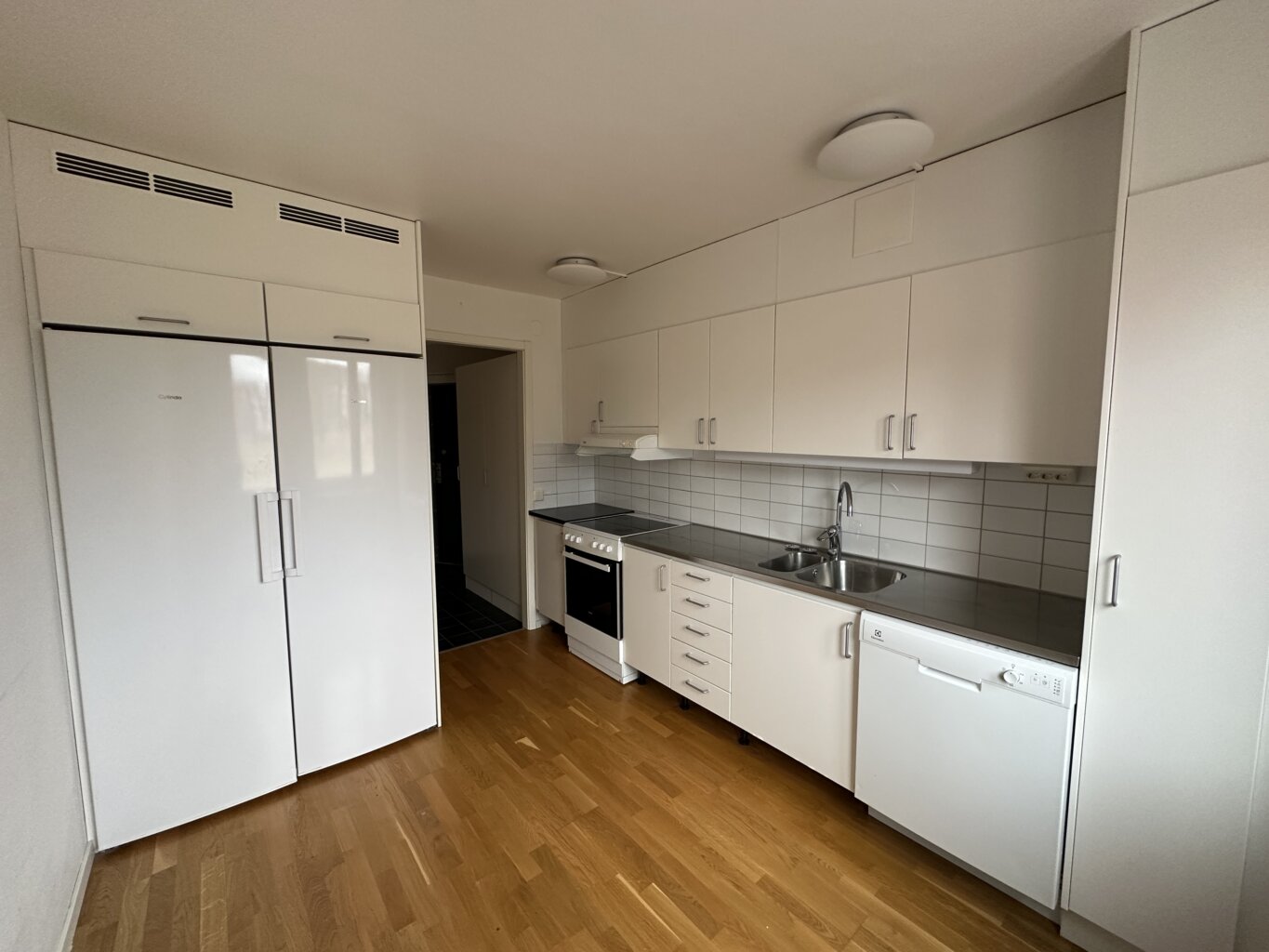 Köket ligger i ett eget rum och är utrustat med hel kyl och frys samt diskmaskin. Här finns gott om arbetsytor och plats för vardagens matlagning.