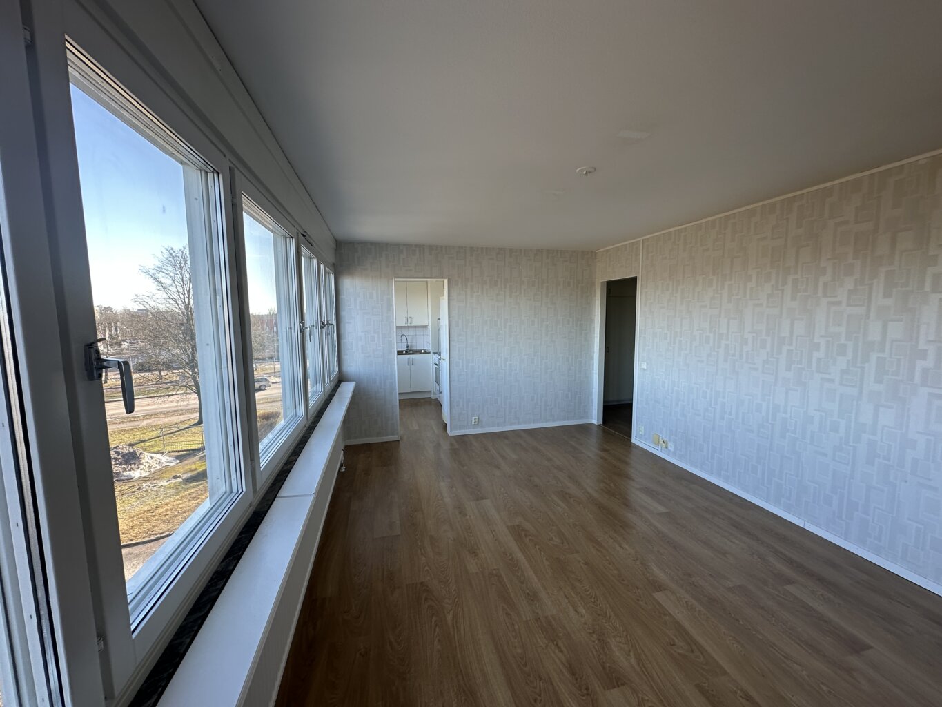 Rakt fram öppnar bostaden upp sig mot vardagsrummet med kokvrå i anslutning. De stora fönstren släpper in rikligt med dagsljus och skapar en ljus och luftig atmosfär. Sovrummet är separat placerat och ger en lugn och avskild plats för vila.