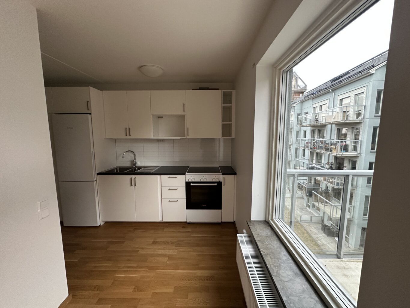 Från hallen nås köket som ligger i ett eget, avskilt utrymme. Köket är rymligt och har stora fönster som ger fint ljusinsläpp. I anslutning finns även balkongen, perfekt för en kopp kaffe eller frisk luft under årets varmare dagar.